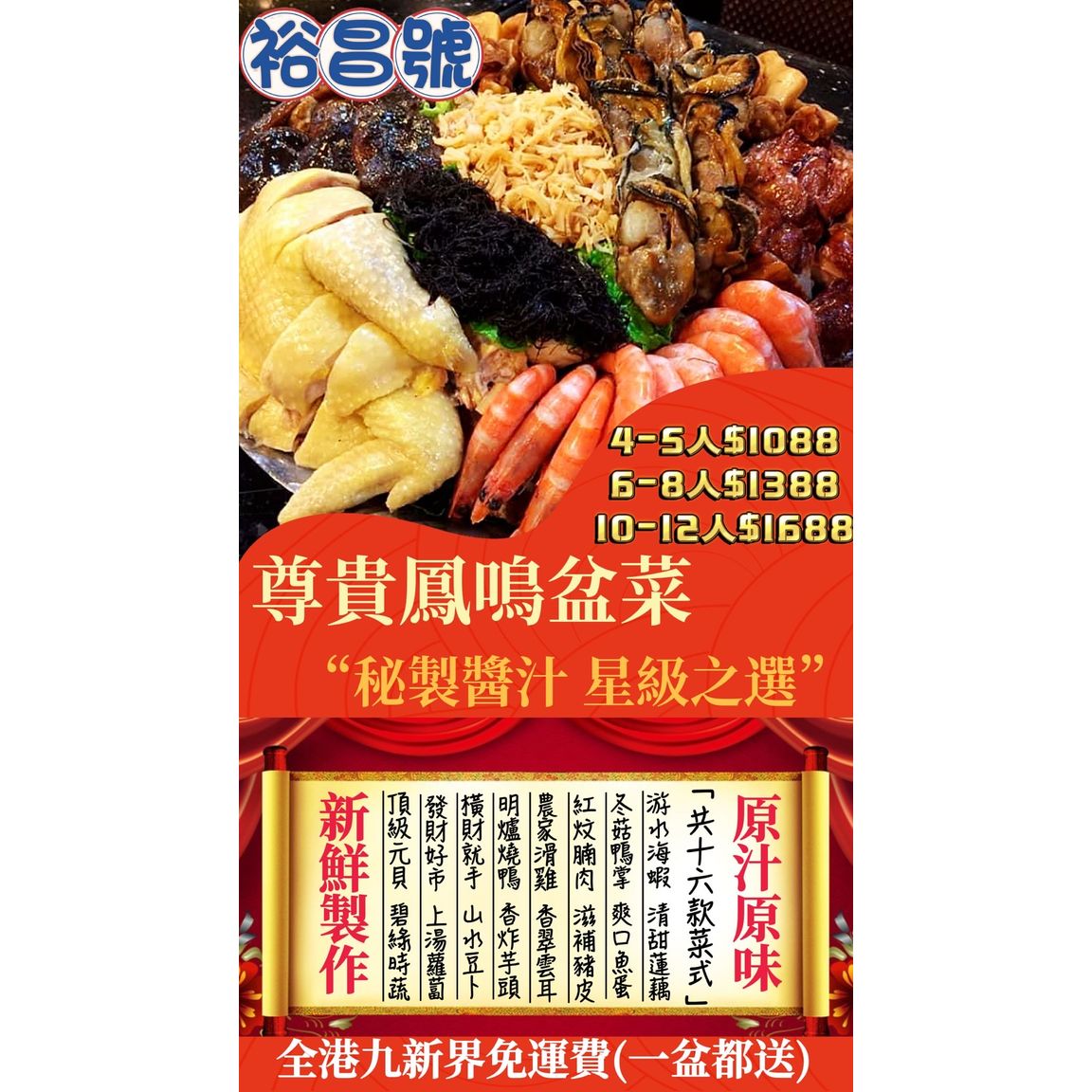 豪華足料盆菜 重要的日子、公司、家宴,香港原味道盆菜又怎能缺席呢! 「裕昌號」應大眾要求,兩款盆菜,分別名為「極上騰龍盆菜」及「至尊鳳鳴盆菜」,分大中細盆,由四人至十二人享用,滿足大家聚餐各項要求。 食材包括 : 原隻南非蠔皇鮑魚、紅燒金蠔、頂級日本宗谷元貝、鮑汁扣花膠、極上紅燒海參、游水大海蝦、明爐燒鴨、農家滑雞、發財好市、橫財就手、蠔皇冬菇、上湯灼蘿蔔、爽滑魚蛋、碧綠時蔬、濃汁鴨掌、清甜、蓮藕、香炸芋頭、香翠雲耳、滋補豬皮、山水豆卜(共20款菜式) 幸福就是,家人在左,愛人在右 美食在桌,團團圓圓, 健康快樂 最少需提前1天預訂、全港九新界免運費(一盆都送) 重要事情需要講三次 免運費/免運費/免運費 *所有送貨如屬於以下偏遠地區須另加$100* *機場/東涌/山頂/迪士尼/馬灣/赤柱/大潭/淺水灣/深水灣/沙頭角/米埔等等*