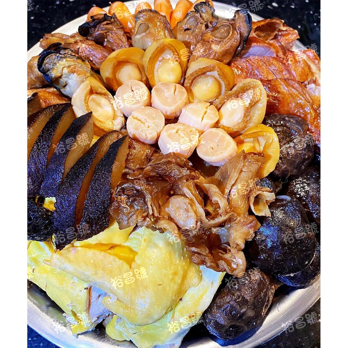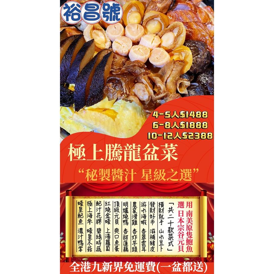 豪華足料盆菜 重要的日子、公司、家宴,香港原味道盆菜又怎能缺席呢! 「裕昌號」應大眾要求,兩款盆菜,分別名為「極上騰龍盆菜」及「至尊鳳鳴盆菜」,分大中細盆,由四人至十二人享用,滿足大家聚餐各項要求。 食材包括 : 原隻南非蠔皇鮑魚、紅燒金蠔、頂級日本宗谷元貝、鮑汁扣花膠、極上紅燒海參、游水大海蝦、明爐燒鴨、農家滑雞、發財好市、橫財就手、蠔皇冬菇、上湯灼蘿蔔、爽滑魚蛋、碧綠時蔬、濃汁鴨掌、清甜、蓮藕、香炸芋頭、香翠雲耳、滋補豬皮、山水豆卜(共20款菜式) 幸福就是,家人在左,愛人在右 美食在桌,團團圓圓, 健康快樂 最少需提前1天預訂、全港九新界免運費(一盆都送) 重要事情需要講三次 免運費/免運費/免運費 *所有送貨如屬於以下偏遠地區須另加$100* *機場/東涌/山頂/迪士尼/馬灣/赤柱/大潭/淺水灣/深水灣/沙頭角/米埔等等*
